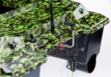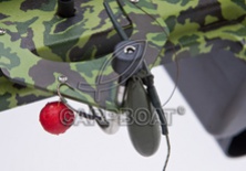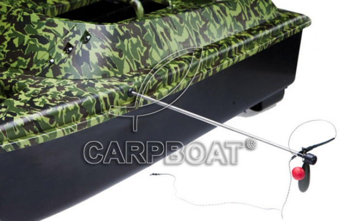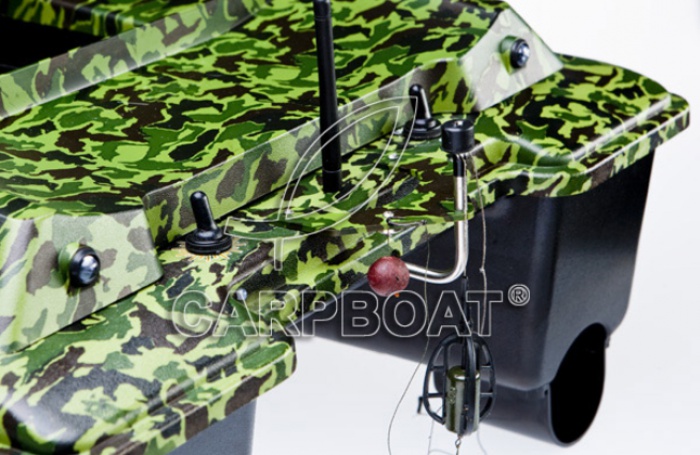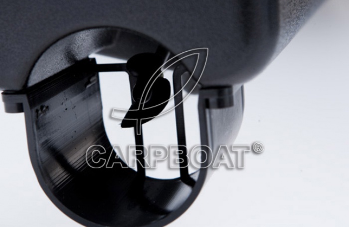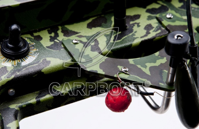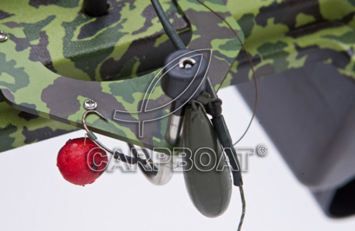 На корме размещена система крепления оснастки, а на боковых штангах два дополнительных крепления, что позволяет заводить три оснастки в точку прикормки.