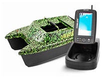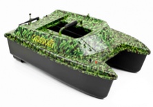 Двойной прикормочный бункер изготовлен из нержавеющей стали. Его открытие и закрытие происходят постепенно. При помощи двух потенциометров на пульте дистанционного управления можно регулировать угол открытия створок. Если вы собираетесь использовать мелкую или сыпучую прикормку, то в этом случае предусмотрена возможность распыления и создания прикормочного облака или же дорожки из прикормки. Всё это осуществляется во время движения прикормочного кораблика или же на одном месте при малом открытии створок.